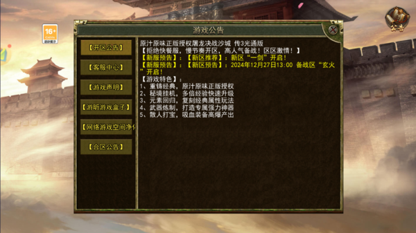 传奇3光通版|12月27日开区公告发表时间:2024-12-18 10:48 传奇3光通版(传奇3高爆版)开区公告 原汁原味正版授权屠龙决战沙城 传3光通版 【拒绝快餐服,慢节奏开区,高人气备战!区区激情!】 【新区推荐】:新区“一剑”开启! 【新服预告】:【新区预告】:2024年12月27日13:00 备战区“玄火”开启! 【游戏特色】 1、重铸经典,原汁原味正版授权 2、秘境挂机,多倍经验快速升级 3、元素回归,复刻经典属性玩法 4、武器炼制,打造专属强力神器 5、散人打宝,吸血装备高爆产出